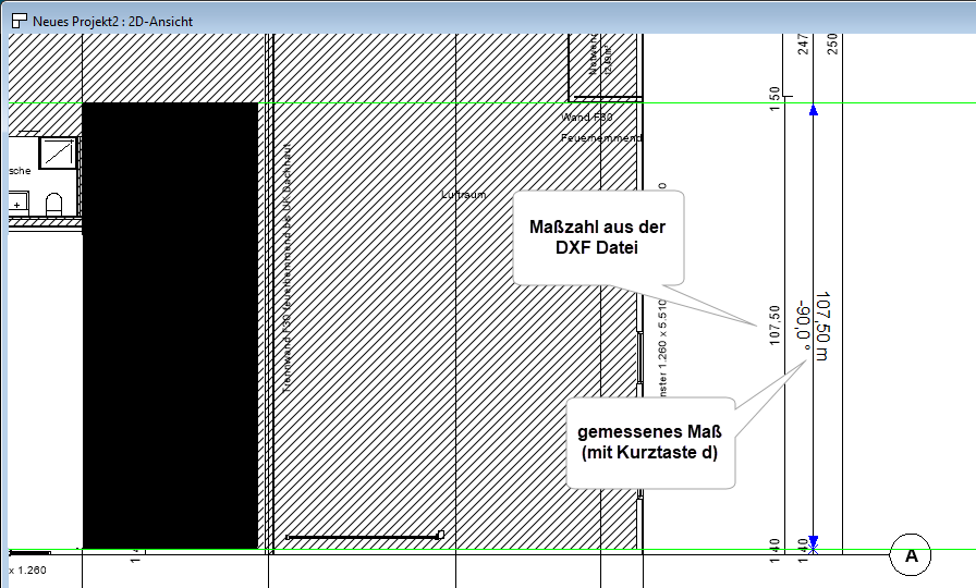 Die Daten in 2D-DXF/DWG-Dateien enthalten oft Maßangaben in Zentimetern oder Millimetern statt in Metern. Dies erkennen Sie direkt nach dem Öffnen der DXF-Datei: