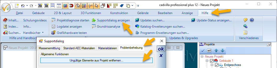 - Gehen Sie zu Hilfe → Supportdialog anzeigen → Problembehandlung → Ungültige Elemente aus dem Projekt entfernen