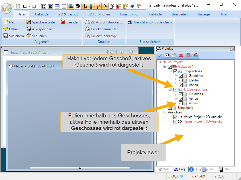 - Aktivieren Sie die ganz oben genannte, neu erstellte 2D Ansicht (Rechtsklick auf neu erstellte 2D Ansicht → als aktuelles Element setzen). Dabei handelt es sich um eine 2D Ansicht, bei der alle Geschosse und Folien aktiviert sind.