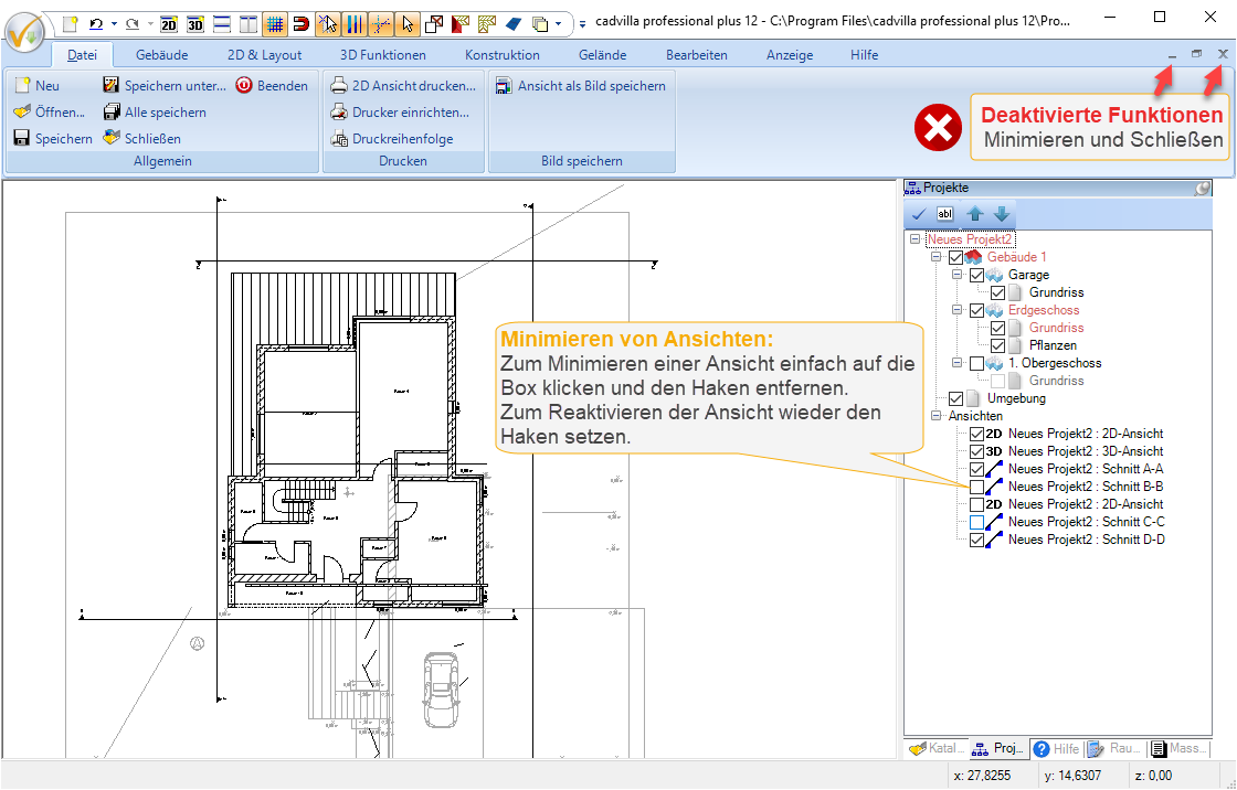 Wichtiger Hinweis: Vermeiden Sie es, für einen einfachen Wechsel jedes Mal eine neue 2D- oder 3D-Ansicht über das Hauptmenü zu öffnen. Dies führt zu unnötig vielen offenen Fenstern und belastet die Rechenleistung.
