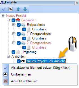 - Per Tastenkürzel (Schnellmethode): Halten Sie die STRG-Taste gedrückt und klicken Sie mit der linken Maustaste im Projektmanager direkt auf die gewünschte Ansicht.