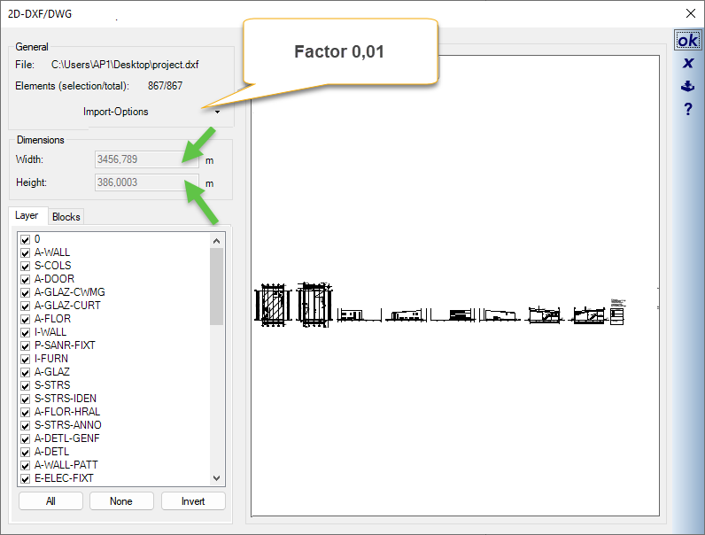The data in 2D DXF/DWG files often contains dimensions in centimeters or millimeters instead of meters. You can recognize this immediately after importing: