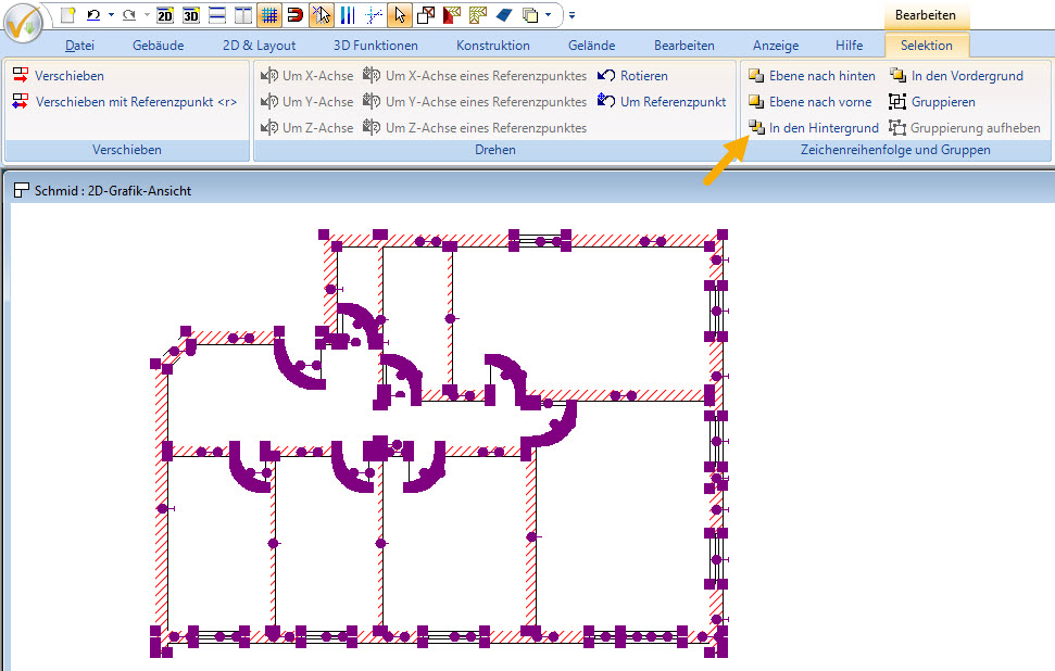 Jetzt klicken Sie auf ‚In den Hintergrund‘. Mit dieser Aktion werden alle gefüllten Polygone in den Hintergrund gesetzt und die Linien treten wieder zum Vorschein.