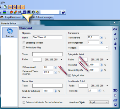 Dazu gehen Sie auf die Funktion „Material editieren“ und ändern im darauf folgenden Dialogfenster im Bereich „Spiegelnder Anteil“ die Werte für