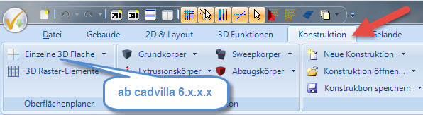 Ab der cadvilla V6 heißt die Bezeichnung der Funktion „Einzelne 3D Fläche“. Die Funktionen unter diesem Menüpunkt (Eingabe über Rechteck, Eingabe über Polygon, Eingabe über Ebene) sind gleich geblieben.