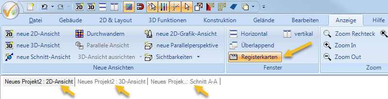 If you are working with tabs in your project, you can switch the view by clicking directly on the respective tab (see arrow). Working with tabs is activated by clicking the red marked icon.